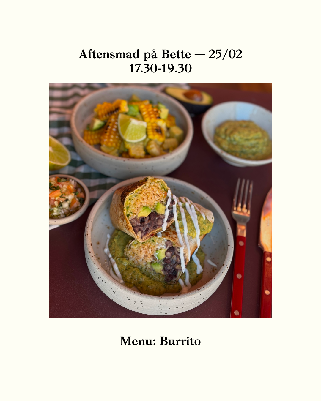 Ugens menu: beans and rice burrito with salsa verde and yogurt, with a creamy grilled corn, avocado and cucumber salad